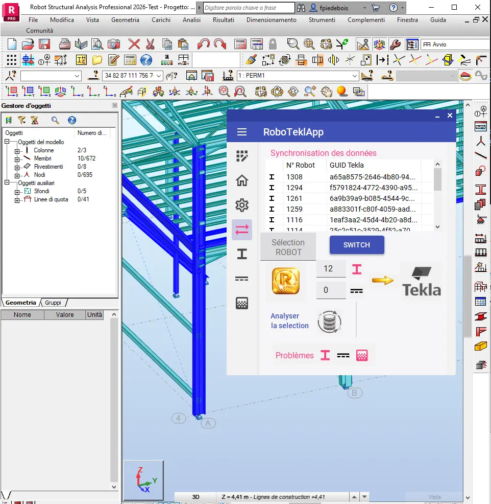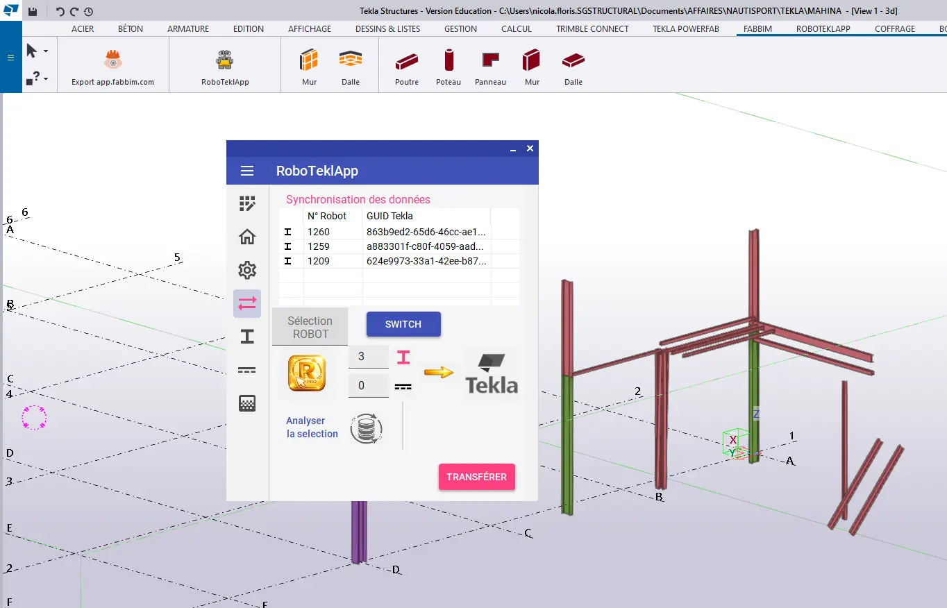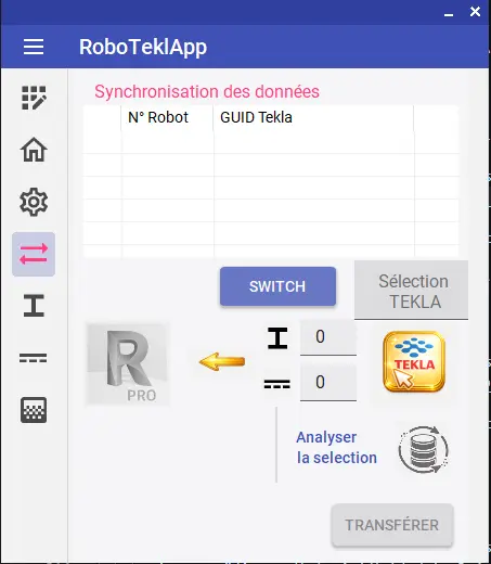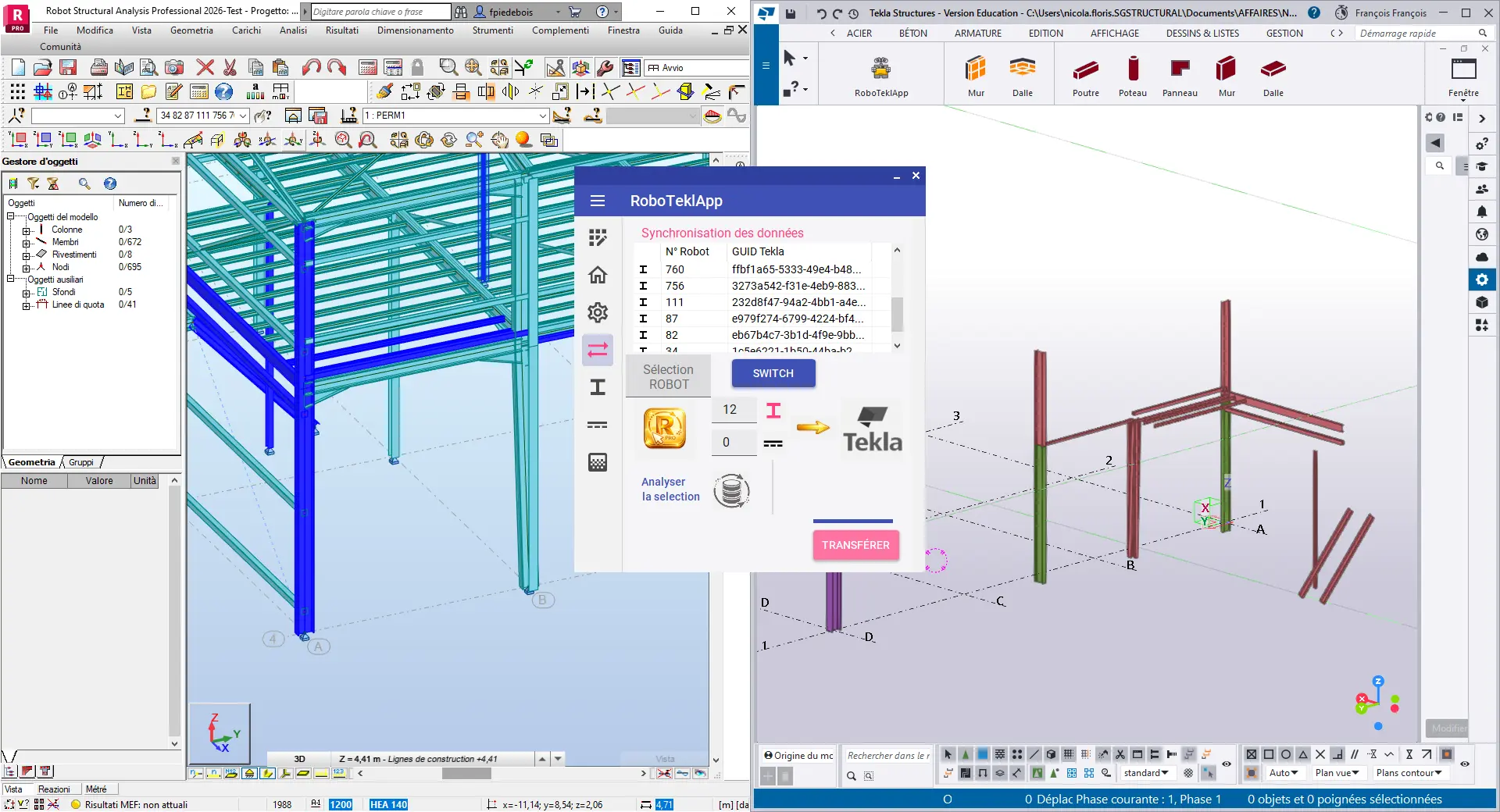 Même logique de transfert, avec inversion du sens via le bouton switch pour envoyer les données de Tekla vers Robot.