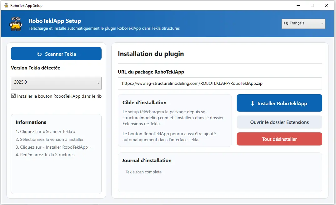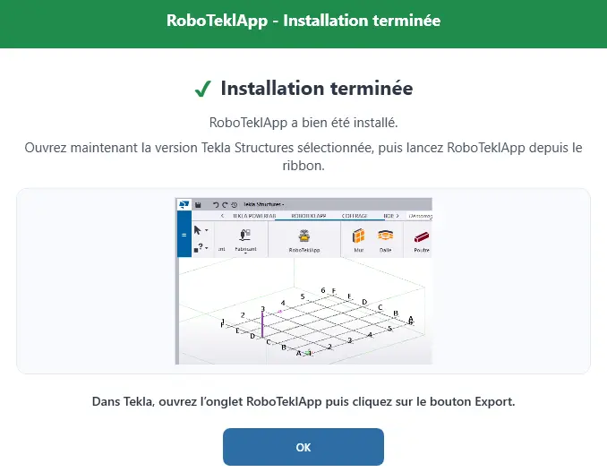 Suivez ces étapes pour installer correctement RoboTeklApp sur votre ordinateur et le rendre accessible directement depuis Tekla Structures.