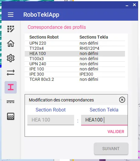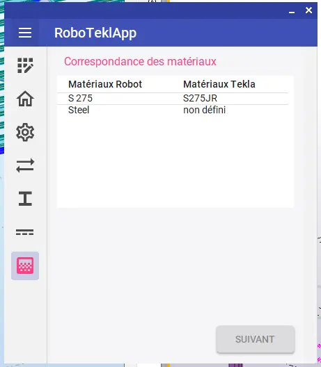 Lorsque des sections, des tôles ou des matériaux ne sont pas reconnus, les icônes correspondantes deviennent roses. Il suffit alors d’ouvrir les tableaux de correspondance et de compléter les noms corrects pour Tekla et Robot.