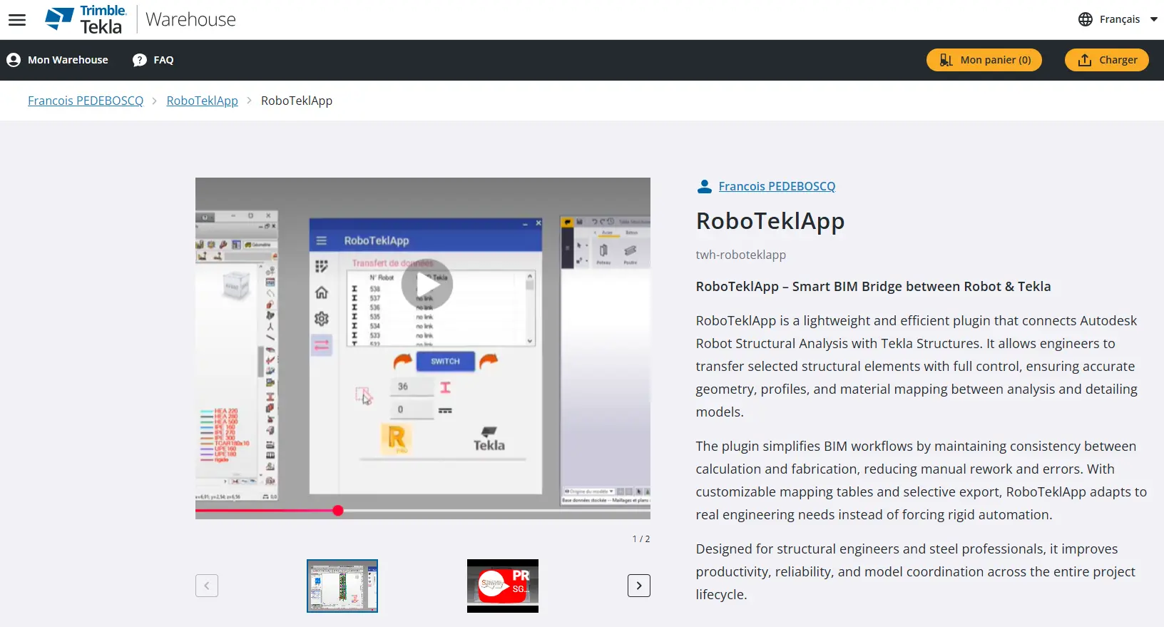 Vous pouvez télécharger RoboTeklApp depuis le site SG Structural Modeling ou via Tekla Warehouse.